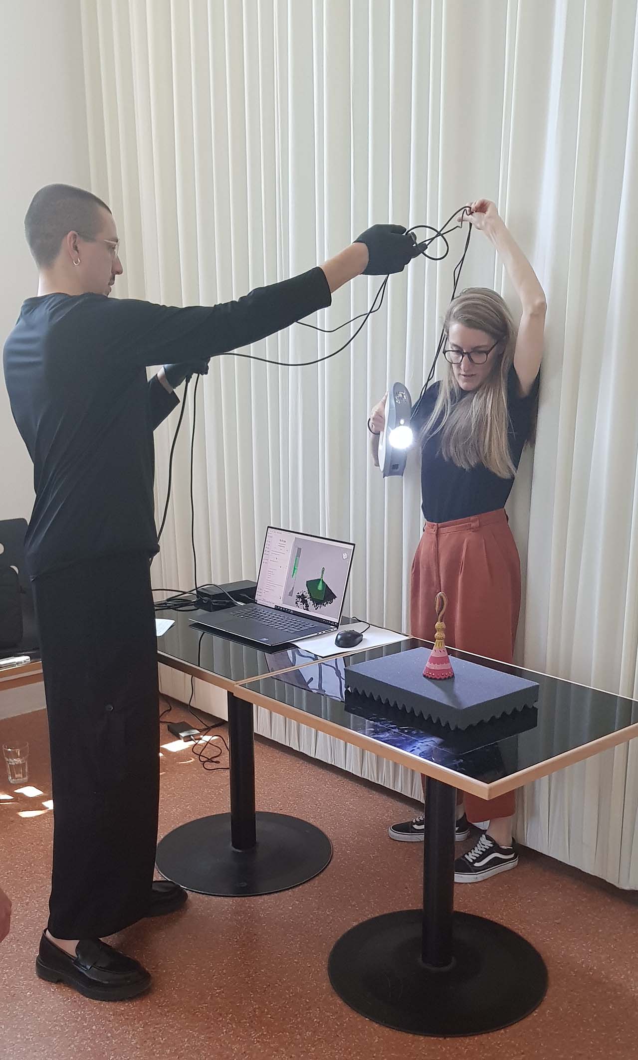 Nach der Projektzusage des BMKÖS um Ostern 2023 ging es dann los. Es folgten die Anschaffung eines 3D-Scanners und eine Einschulung im Juni 2023. Für diesen Termin stieß auch Felix Kofler aus der Sammlung Design zu uns. Felix Kofler hatte bereits mit 3D-Scannen zu tun und plant, auch nach Projektende Scans für das MAK anzufertigen. Nun können wir also selbst unsere ersten Objekte dreidimensional erfassen. Der 3D-Scanner Artec EVA – oder „das Bügeleisen“, wie wir ihn liebevoll getauft haben – scannt mit 16 frames pro Sekunde und einer 3D-Auflösung von 0,2mm. Wir sind gespannt, ob wir dadurch vielleicht sogar bisher Unbemerktes an den Objekten entdecken werden.