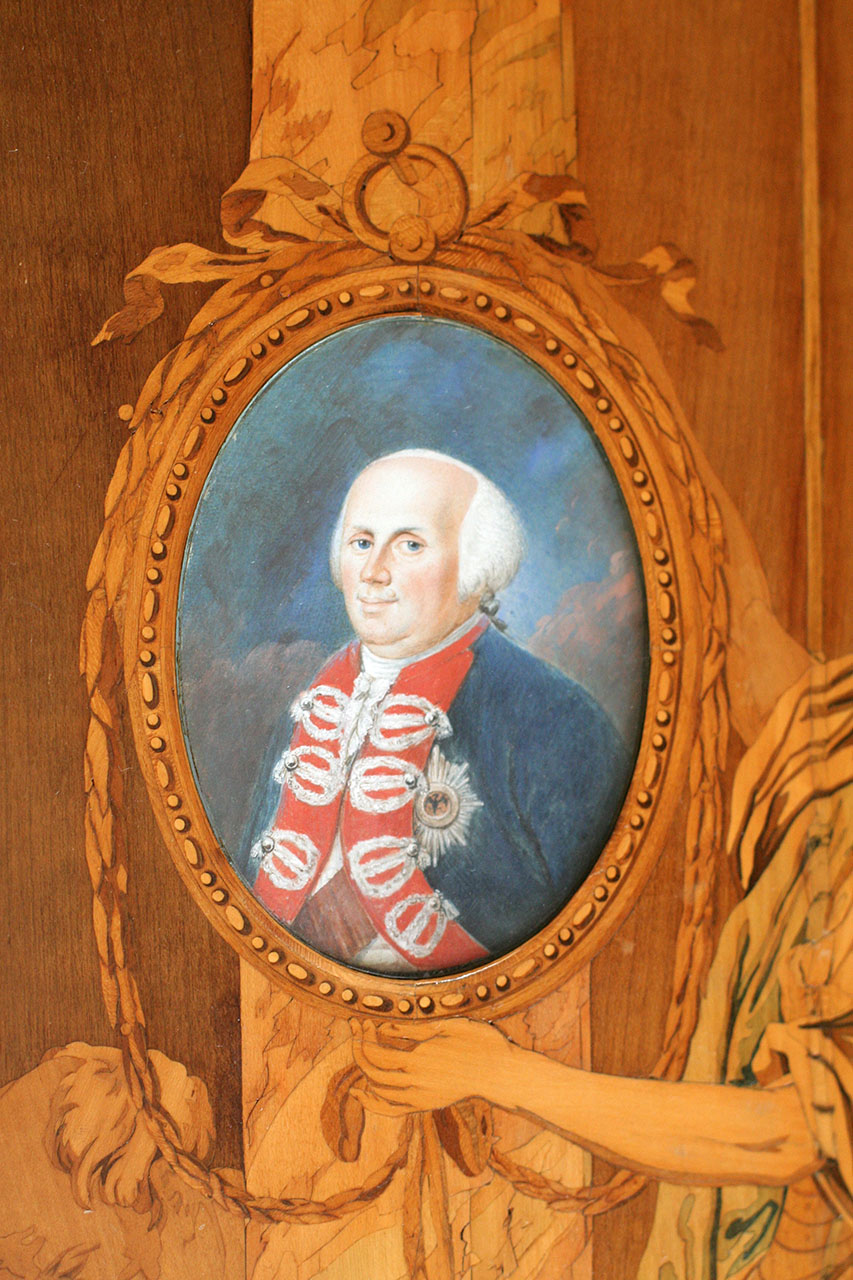 - Detail von der Mitteltür des Berliner Kabinettschranks mit dem Porträt des Preußischen Königs Friedrich Wilhelm II © SMB Kunstgewerbemuseum/A. Stiegel