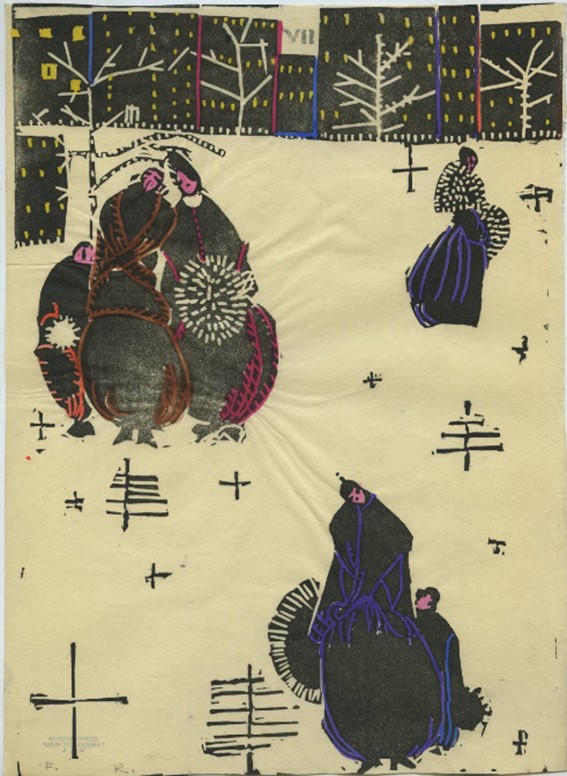 Ein fantastisches Resultat dieser Beschäftigung ist das Mappenwerk Mode Wien 1914/5, an dem etliche WW-Künstler*innen beteiligt waren. Die Linolschnitte auf Japanpapier sind von der Machart her eine Hommage an die berühmten Ukiyo-e. Rix setzt in ihren Blättern zu dem japanische Stilmittel ein: Eine Winterszene zeigt wenig Tiefe, dafür viel Platz um die Figurengruppen. Zugleich findet sie mittels Abstraktion zu einer sehr modernen Sprache: Die Bäume werden nur schematisch angedeutet, die Häuser sind New York näher als der Wiener Ringstraße.