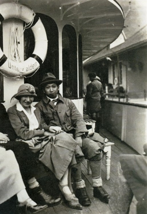 Zwei Fotos von Felice und Isaburo zeigen, wie sich beide auf die jeweils andere Kultur auch jenseits der Kunst eingelassen haben. Einmal ist das Paar auf dem Dampfschiff Unterwalden zu sehen, das bis heute auf dem Schweizer Vierwaldstättersee verkehrt. Isaburo trägt traditionelle Bergsteigerkleidung – Knickerbocker, Wollstrümpfe und Bergschuhe –, Felice hingegen ist städtisch gekleidet. Auf dem zweiten Bild, das in Kyoto entstanden ist, sieht man umgekehrt Felice im traditionellen Kimono und Isaburo im urbanen Anzug.