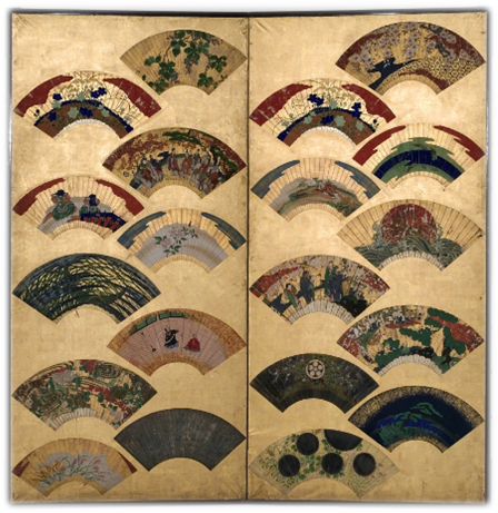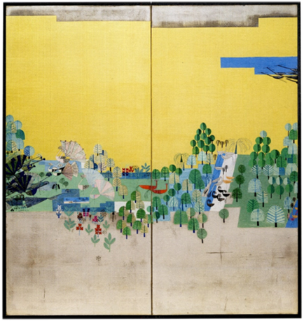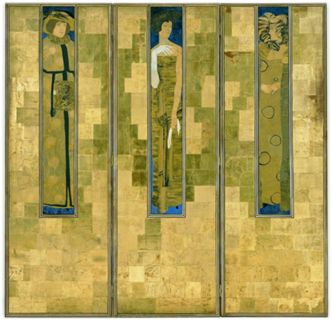 Koloman Mosers Paravent aus dem Jahr 1906 ist ein Beispiel für die Beschäftigung mit den Vorbildern auf zwei Ebenen: typologisch und gestalterisch. Er entwarf einen dreiteiligen Wandschirm, gestaltet mit Blattgold und Figuren-Collagen aus Marmorpapier. Deren beschnittene Darstellung in extrem hohen Formaten folgt der japanischen Formensprache. Ebenso war der Goldgrund ein klassisches Gestaltungselement, wie ein Wandschirm aus dem 18. Jahrhundert zeigt. Auch in Felice Rix-Uenos um 1935 entstandenen Paravent nimmt die Goldfarbe gemeinsam mit einem schmutzigen Silber die größte Fläche ein, das Landschaftsmotiv ist in der Mitte zusammengefasst. Seine Kleinteiligkeit wird durch die umgebende Leere beruhigt. Der Paravent ist eine sehr überzeugende moderne Interpretation der Vorbilder, die über das rein Dekorative deutlich hinausgeht.