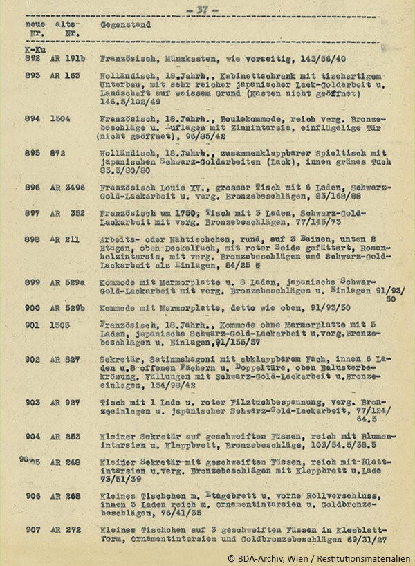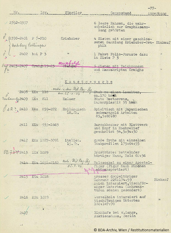 Ab 1945 suchten die amerikanischen Kunstschutzoffiziere, bekannt als „Monuments Men“, und das Bundesdenkmalamt die früheren EigentümerInnen der in Altaussee gelagerten Objekte. Zum Tisch wurde handschriftlich notiert: „Ö AR? “. Das bedeutet wahrscheinlich „Österreich Alphonse Rothschild?”.