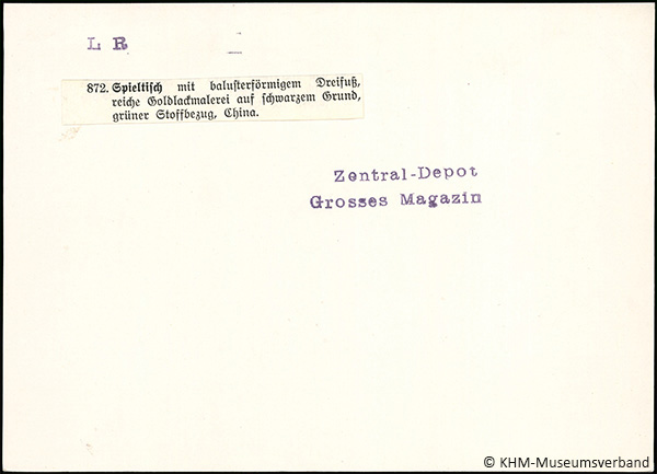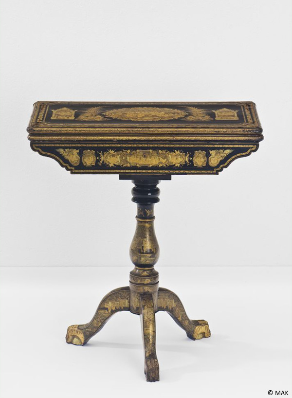 Der im MAK befindliche chinesische Spieltisch wurde um 1825 gefertigt. Seine Tischplatte ziert reiche Lackmalerei in Gold auf schwarzem Grund. Sie zeigt Landschaftsdarstellungen mit vielfiguriger Staffage und Kampfszenen unter Bambusstauden. 1964 wurde der Spieltisch als Leihgabe des Bundesdenkmalamtes inventarisiert. Seine früheren EigentümerInnen waren unbekannt – bis 2009. (MAK Online Sammlung)