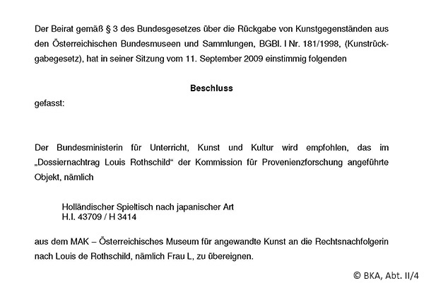 Nun konnte ich ein Dossier erstellen und am 9. November 2009 empfahl der Kunstrückgabebeirat die Rückgabe des Spieltischs. Hier der gesamte Beiratsbeschluss.