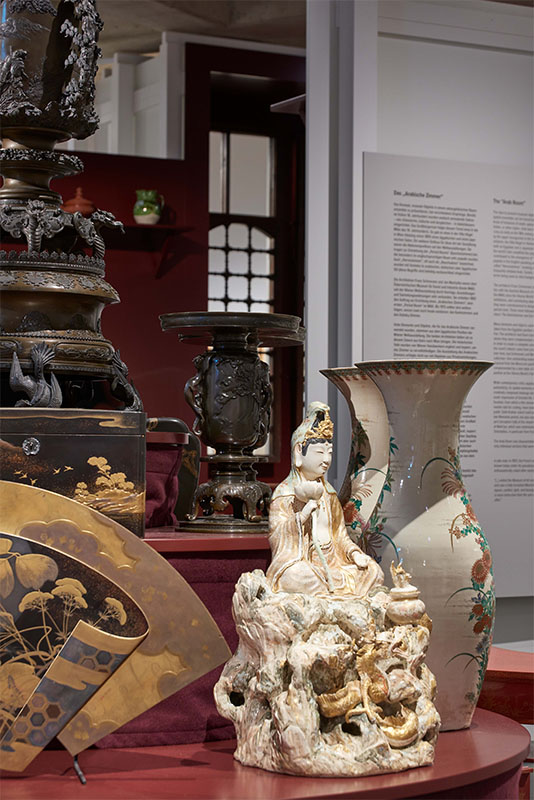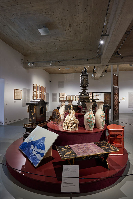 As one enters the exhibition, there is a round centerpiece with (probably intentionally) randomly selected Japanese art pieces, each having a story linked to the 1873 Vienna World’s Fair. The most eye-catching piece is a beautiful bookstand in pristine condition, with gold and maki-e decoration on a black lacquer surface. This piece was acquired during the Vienna World’s fair; however, one is not provided with the full story behind it, unfortunately. Another great piece is a black lacquer cabinet with gold and maki-e decoration from 1873, in very good condition, and a wooden desk adorned with gold and maki-e decoration, displayed alongside vases, wall panels, an étagère, and more, all presented on rounded „Oriental Red“ podiums.