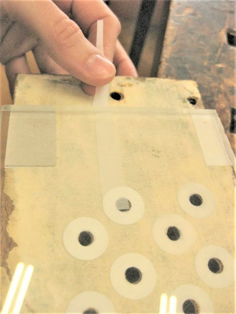 - Eine auf die Unterseite des windschiefen Pfeifenstocks gelegte Plexiglasscheibe simuliert die ebene Windlade. Unterschiedlich hohe Papierringe dichten die Löcher nach außen ab © Marianne Siegl/MAK