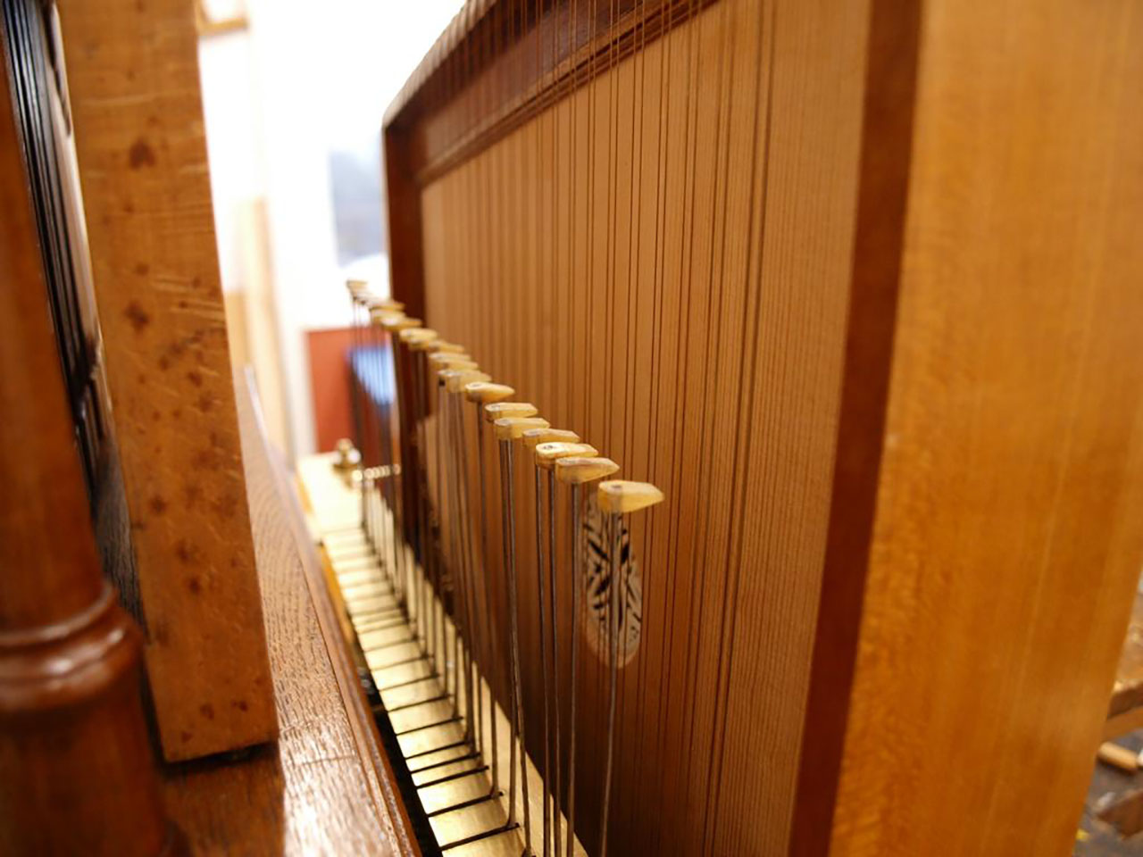 Beim Nachbau der Harfe orientierte ich mich bei der Holzauswahl (Kirsche, Ahorn, Buche und Fichte) und der Pergamentrosette hauptsächlich am Vergleichsobjekt im Palais Liechtenstein. Länge und Durchmesser der Messingsaiten wurden nach der vorgegebenen Stimmtonhöhe der Flöten und der gewünschten Auslastung des Materials ermittelt.