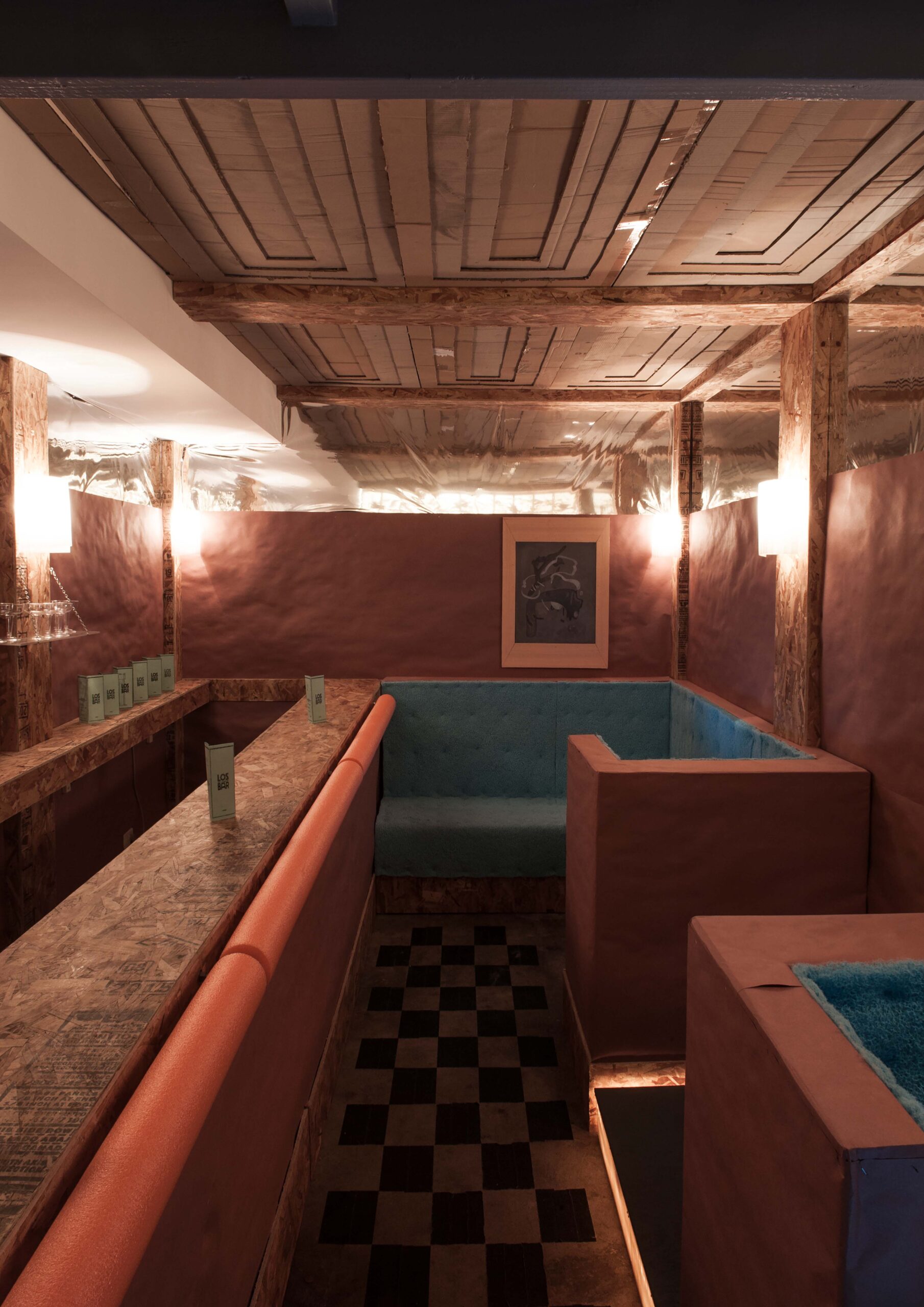 Christoph: Wir haben dann tatsächlich am nächsten Tag zu bauen begonnen. Zunächst sind wir in den örtlichen Baumarkt gefahren und haben uns dort umgeschaut. Wir wollten die Bar als Ganzes schrumpfen lassen, auch mit der Wertigkeit der Materialien. Ausgehend von unserem Budget skalierten wir die Materialien von den teuersten, die es damals gab, zu den billigsten, die wir dort finden konnten. Bei der ersten Exkursion in den Baumarkt, suchten wir nach Substituten für jedes wertvolle Material der originalen Loos Bar: also Marmor wurde zu OSB-Platten, Glas wurde zu Fliegengitter, Mahagoni wurde zu Karton etc.. Es hat uns sehr viel Spaß gemacht, uns die Materialien auszudenken und dann über Detaillösungen nachzudenken. Zu dem Zeitpunkt war noch kein Gedanke dabei, wie wir diese Bar wirklich betreiben wollen und wie sie funktionieren würde.