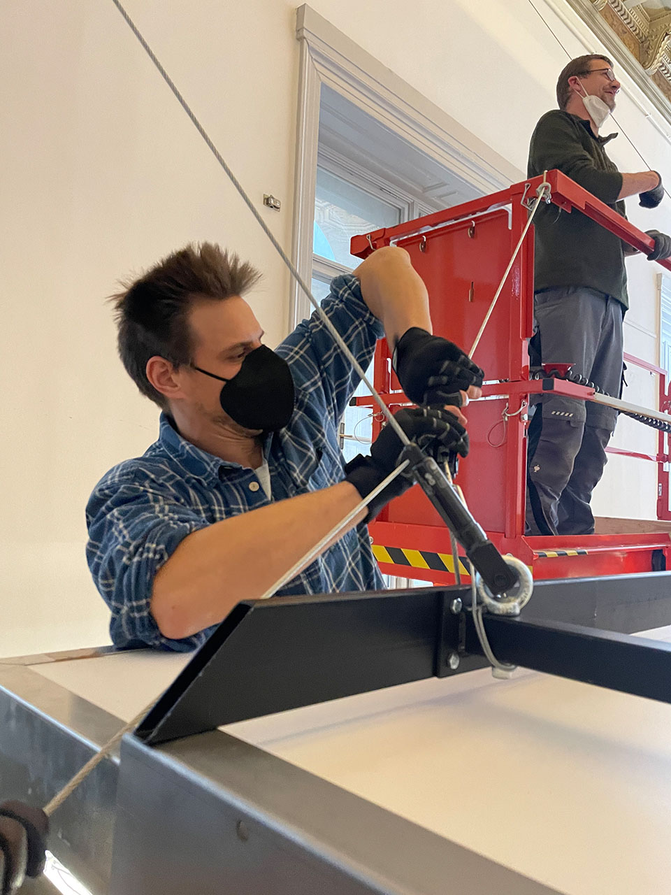 - Installationsaufbau RELAX, 2022 Christoph Meier, Ute Müller, Robert Schwarz, Lukas Stopczynski im Bild: Lukas Stopczynski beim Aufbau der Decke aus der LAX BAR © MAK/Marlies Wirth