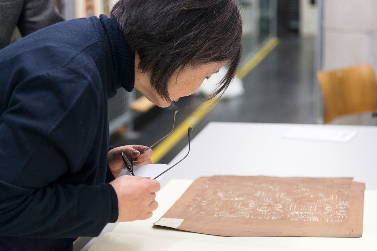 - Mine Scheid-Katayama, Mitarbeiterin MAK-Sammlung Asien, mit einer Färbeschablone (Katagami) MAK-Depot © MAK/Mona Heiß Katagami im MAK
