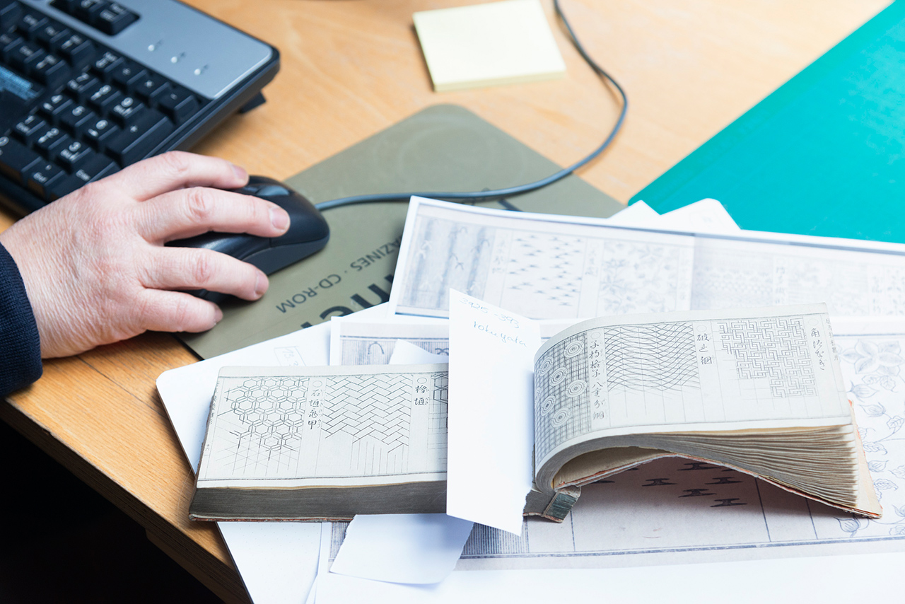 Zahlreiche Versuche, die Katagami-Sammlung fachgerecht zu beschreiben und auch in Kooperation mit japanischen FachkollegInnen und Museen zugänglich zu machen, sind an der großen Anzahl und Vielfalt gescheitert. Ein internationales Treffen zum Thema „Katagami in the West“ an der Universität Zürich im Jahr 2016, das die Probleme in der Erfassung von Katagami untermauerte, motivierte uns, es nochmals zu versuchen. 2017 starteten wir das Projekt der Digitalisierung aller Katagami – über 4 000 Abbildungen sind bis jetzt vorhanden. Mithilfe historischer Musterbücher konnten wir zu den Motiven außerdem eine fachgerechte, den westlichen und auch japanischen Standards genügende Beschreibung verfassen. Zum jetzigen Zeitpunkt sind über 600 mit detaillierten Datenblättern versehene Katagami in der Online-Datenbank des MAK veröffentlicht – und täglich werden es mehr. Für dieses Projekt konnte das MAK eine in Wien lebende Japanerin gewinnen, eine dreisprachige Bearbeitung in Deutsch, Englisch und Japanisch zu erstellen. Eine Besonderheit unserer Katalogisierung ist auch das digitale Zusammenfügen von Schablonen-Sets, wodurch die Muster erst ersichtlich werden.