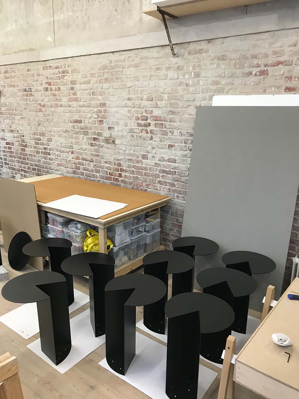 Als die Baumärkte wieder öffneten war ich endgültig in einem für mich erträglichen „New Normal“ angekommen. Ich habe weiterhin Tische verpackt und an den Objekten für die Ausstellung gearbeitet. In dieser Zeit wurden auch die Gänge der Bauhäuser, Hornbachs und Obis zu meinem erweiterten Studio – dies hat sich auch in den Entwürfen und in dem Titel der Ausstellung Hardware − widergespiegelt.