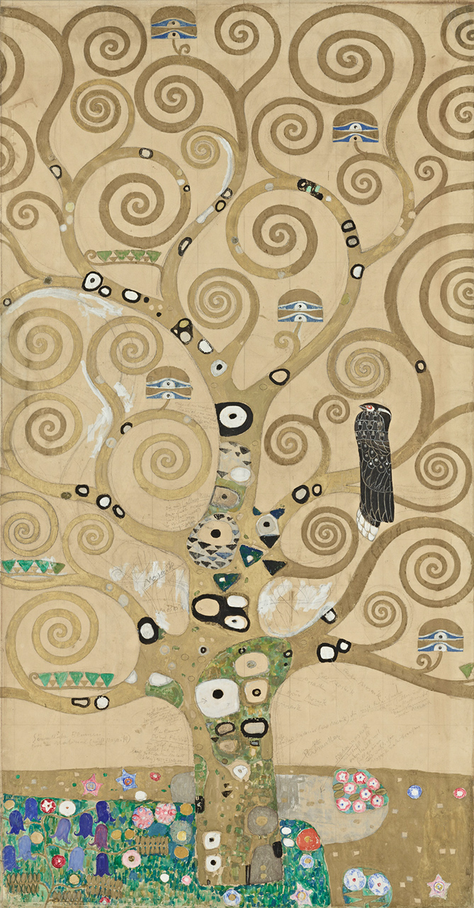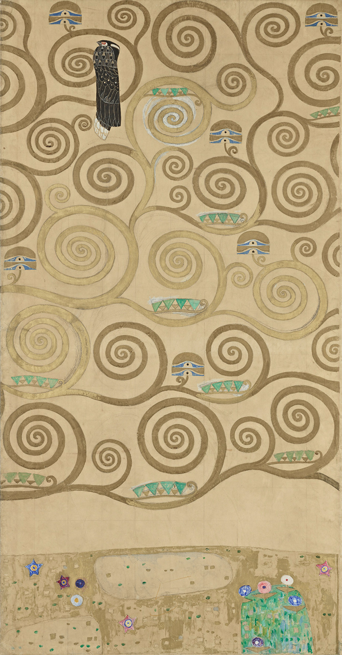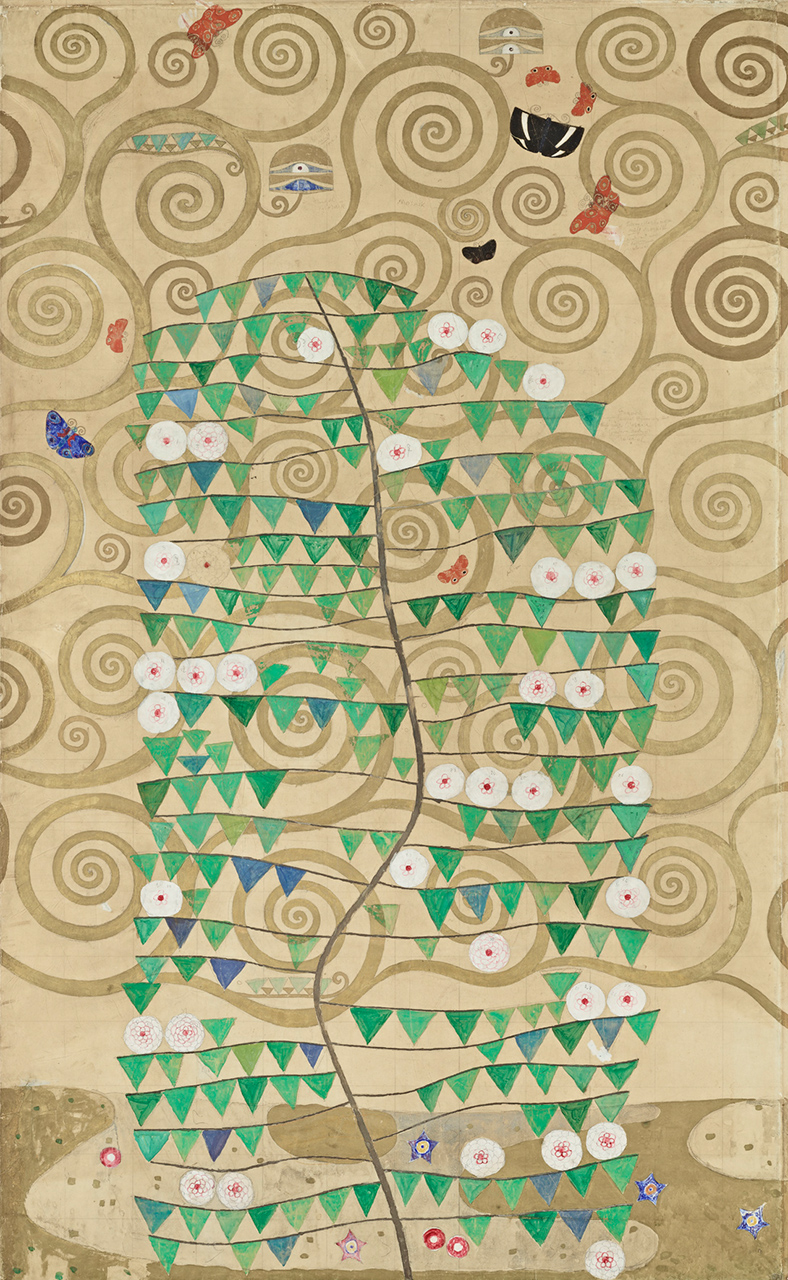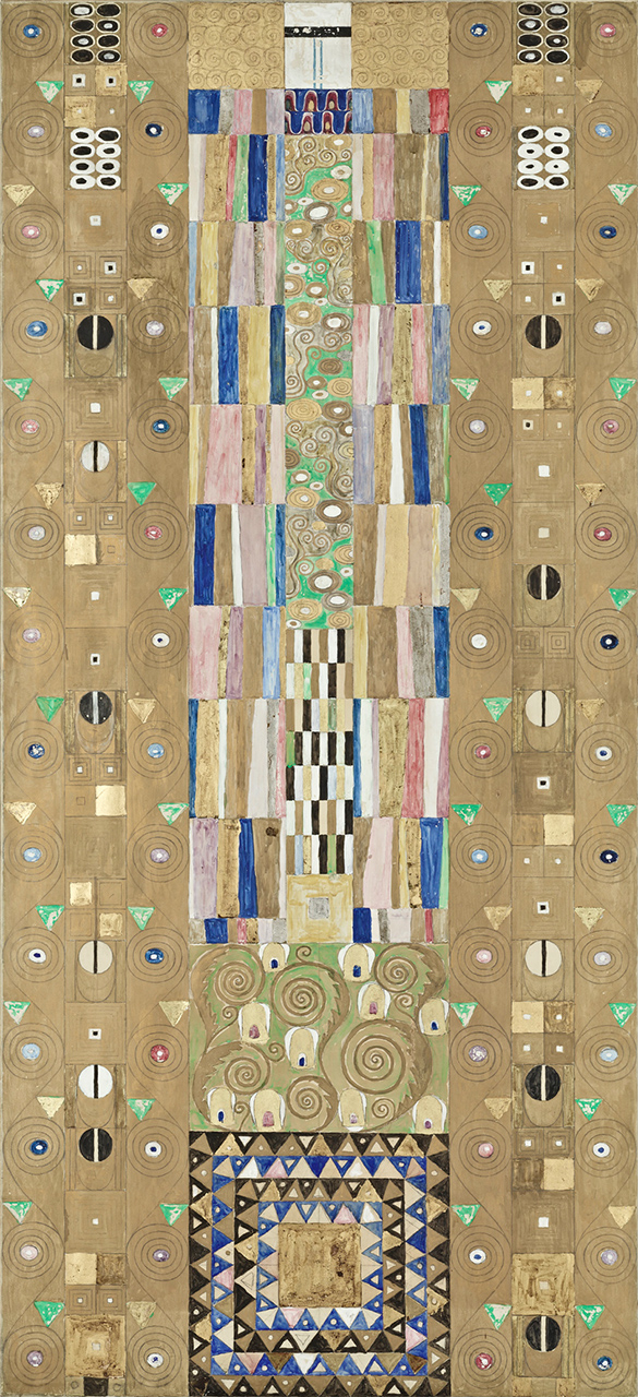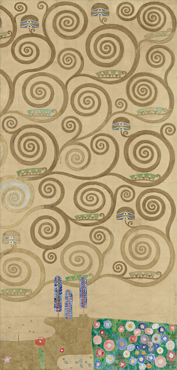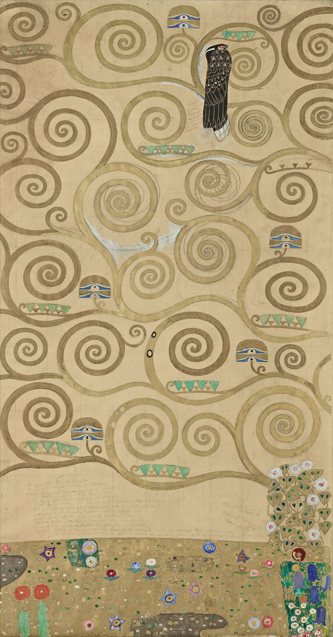 Klimts Entwurfszeichnungen für die Längswände des Speisezimmers sind auf Transparentpapier, sozusagen einem „billigen Pausenpapier“ ausgeführt. Diese Grundfläche wurde von Klimt in einer maximalen Ausdehnung von 250 cm Höhe und 160 cm Breite verwendet. Interessant ist dabei auch der nicht bemalte Rand, der wie die Bildflächen selbst genaue handschriftliche Anweisungen Klimts zur Umsetzung der Entwürfe als Mosaik enthält. So gibt es beispielsweise Angaben, was in „Perlmutter, Material (Email oder Glas), leicht gebuckeltem Metall (goldig aufzusetzen)“ ausgeführt werden soll.