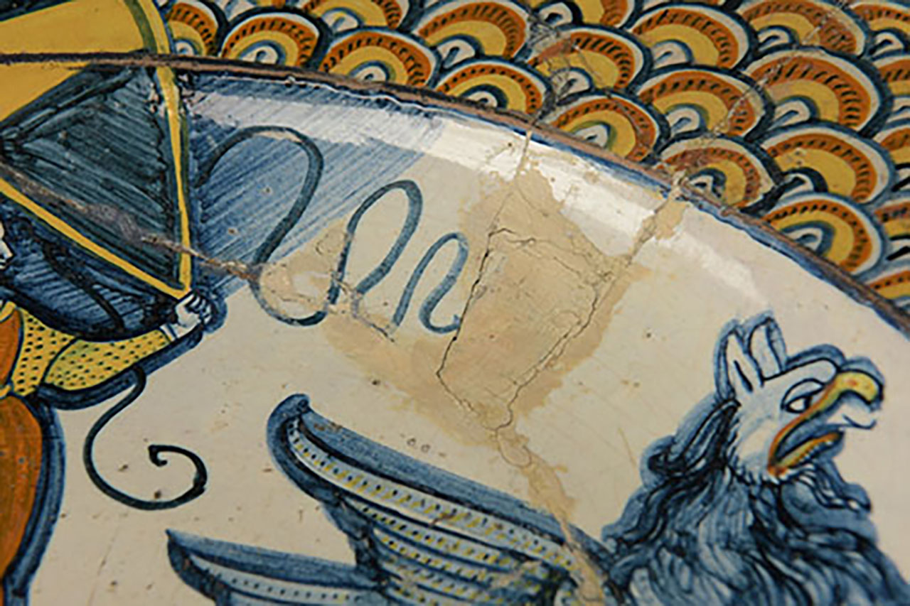 Das bearbeitete Konvolut umfasste einige Schüsseln, Teller, einen Krug sowie eine Bildplatte, die alle im Bereich der Majolikakunst einzuordnen sind. Dieser Begriff bezeichnet Produkte aus Irdenware mit Zinnglasur, die in unserem Fall aus unterschiedlichen herausragenden Keramikwerkstätten in Spanien und Italien stammen. Zeitlich lassen sich die Objekte in die Blütezeit der Majolikamanufaktur einordnen – nämlich vom späten 16. Jahrhundert bis ins beginnende 18. Jahrhundert.