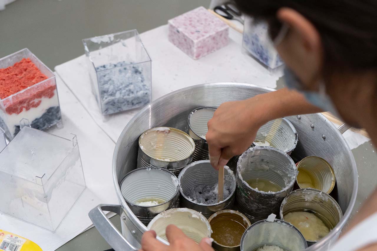 With a critical look at recycling, we explored which resources to better take out of the cycle, in order not to be exploited further. The cut, shredded and blended garments made from petroleum were then turned into chunks of solid matter to be archived for the generations to come.