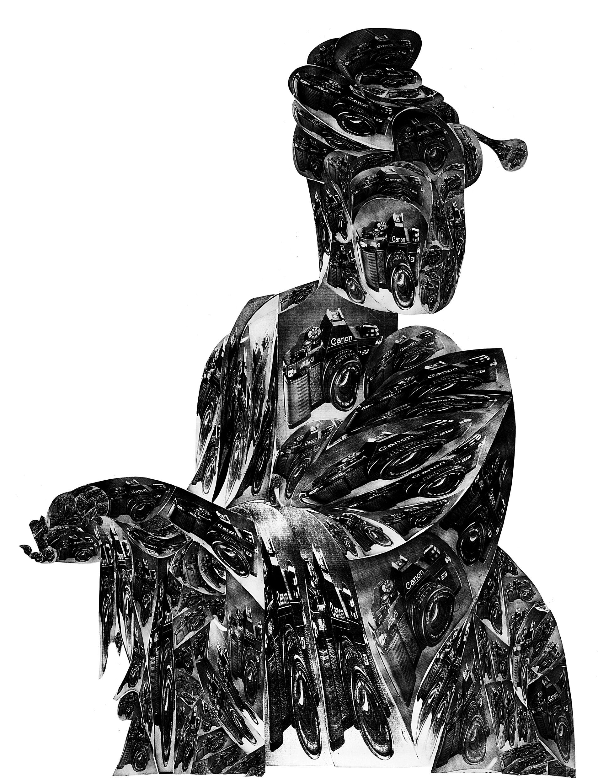 - THOMAS BAYRLE Wenn etwas zu lang ist – mach es länger Thomas Bayrle, Canon meets Sharaku, 1989 Collage auf Holz © Wolfgang Günzel