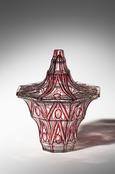 - DAS GLAS DER ARCHITEKTEN Wien 1900–1937 Emanuel Josef Margold, Deckelvase, vor 1916; farbloses Kristallglas mit roten Auflagen, Glasschnitt Ausführung: Carl Schapel, Haida (Nový Bor, CZ) © MAK/Georg Mayer
