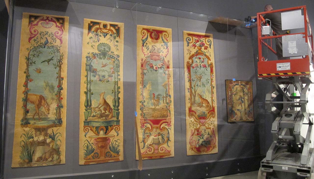 „Ein wichtiger Schritt im Rahmen eines Leihverkehrs ist auch die Klärung der Form der Präsentation – in Vitrinen, an der Wand oder auf Podesten – in enger Zusammenarbeit mit der Restaurierung. Vor allem bei Textilien muss vorab sehr genau überlegt werden, welche Montagevorrichtungen verwendet werden können und ob die Objekte hängend oder liegend ausgestellt werden sollen. Visitors to Versailles zeigte die Teppiche sowohl im Schloss Versailles als auch im Metropolitan Museum of Art leicht schräg hängend in Vitrinen. Auch die Lichtbedingungen und die Luftfeuchtigkeit werden seitens der RestauratorInnen vorgegeben und sind am Ausstellungsort unbedingt einzuhalten“, so Schneeweiss.