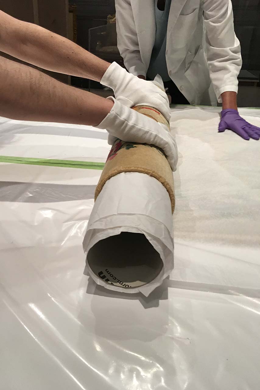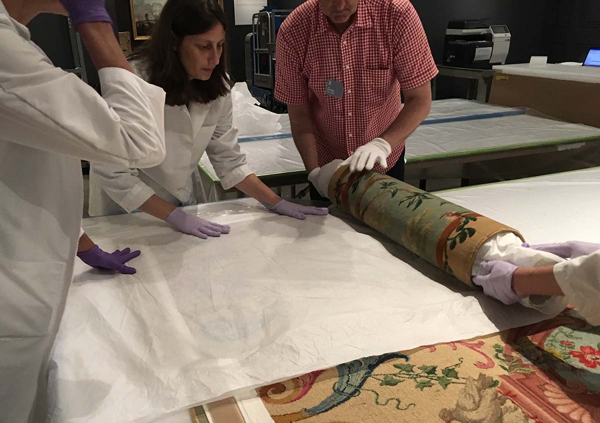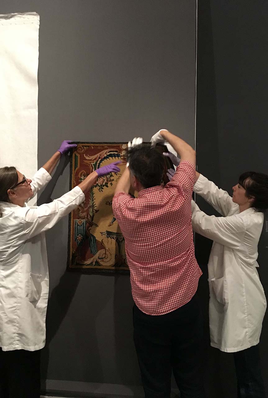 “An important step in the loan process is the choice of how to present the object―in a display case, on the wall or on a pedestal―together with the staff of the conservation department. Particularly in the case of textiles one has to carefully consider which mounting fixtures can be used and whether the objects should be exhibited in a hanging or lying position. Visitors to Versailles displays the carpets in both the Palace of Versailles as well as the Metropolitan Museum of Art in a slightly slanted, hanging position in display cases. The lighting conditions and the humidity of the display room are specified by the conservation experts and must be adhered to at the exhibition venue,” Schneeweiss states.