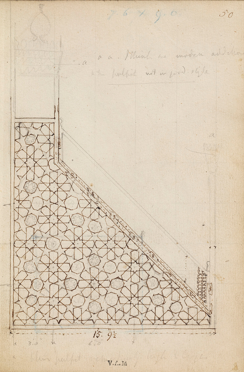 - James William Wild The geometric pattern of the minbar of Sultan, Lajin in the Ibn Tulun Mosque, Sketchbook, Cairo, 1840–1845 V&A, London, Inv. E.3841:56-1938 © Victoria and Albert Museum, London