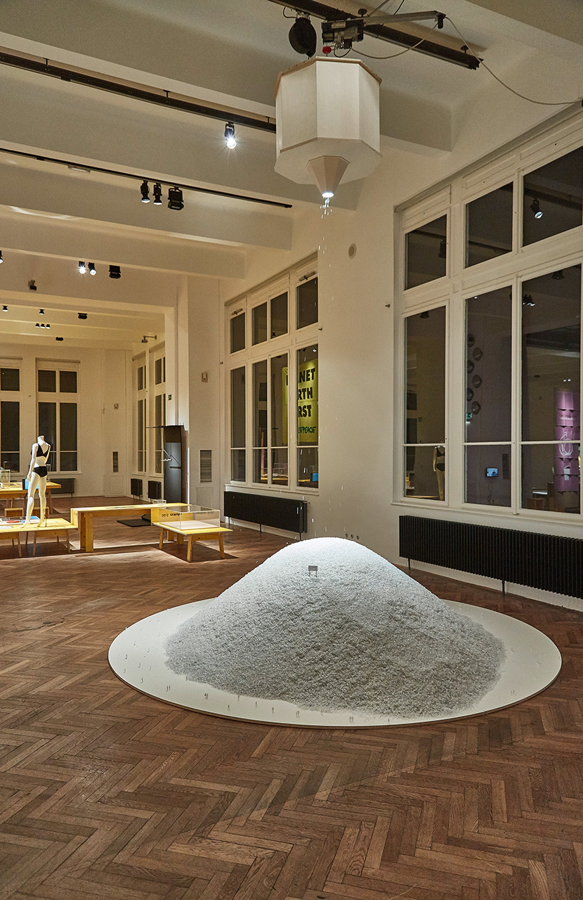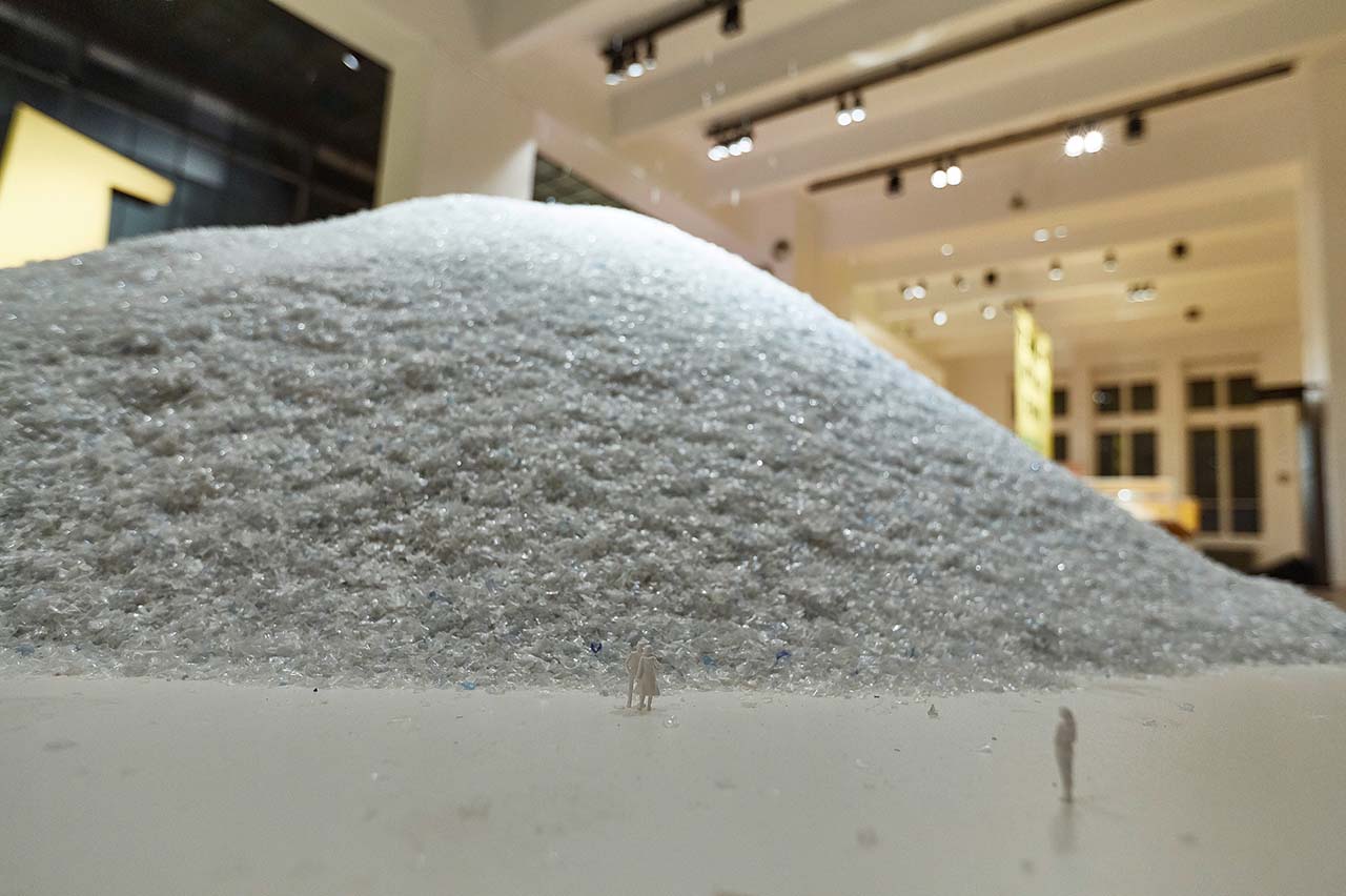 Als einen wichtigen Bereich der Betätigung (nicht nur) für Kreative haben wir die „neue nachhaltige Arbeit“ ausgerufen. Darunter verstehen wir Projekte, die Themen der Ökologie ganz oben auf ihre Design-Agenda setzen. Unter anderem konnten wir die Designer von breadedEscalope gewinnen, eine Arbeit zu entwickeln, die sich mit der Nutzung und Verwertung von Kunststoff auseinandersetzt. Im Rahmen ihrer intensiven Recherchen sind breadedEscalope immer wieder auf unvorstellbare Zahlen gestoßen: etwa auf die Zahl 300 Millionen Tonnen – die jährliche Produktionsmenge von Kunststoff weltweit. Um welche Dimensionen es sich hier handelt, wird mit der Installation Peak Plastic begreifbar, die breadedEscalope für die Ausstellung StadtFabrik: Neue Arbeit. Neues Design. im MAK geschaffen hat. Eindrucksvoll werden hier die Massen an Kunststoff in Bezug zum menschlichen Maßstab gesetzt. Auf eine ästhetisierte Inszenierung des Abfallbergs im Maßstab 1:50 rieselt ein steter Regen aus PET-Recyclat, der den österreichischen Verbrauch darstellt.