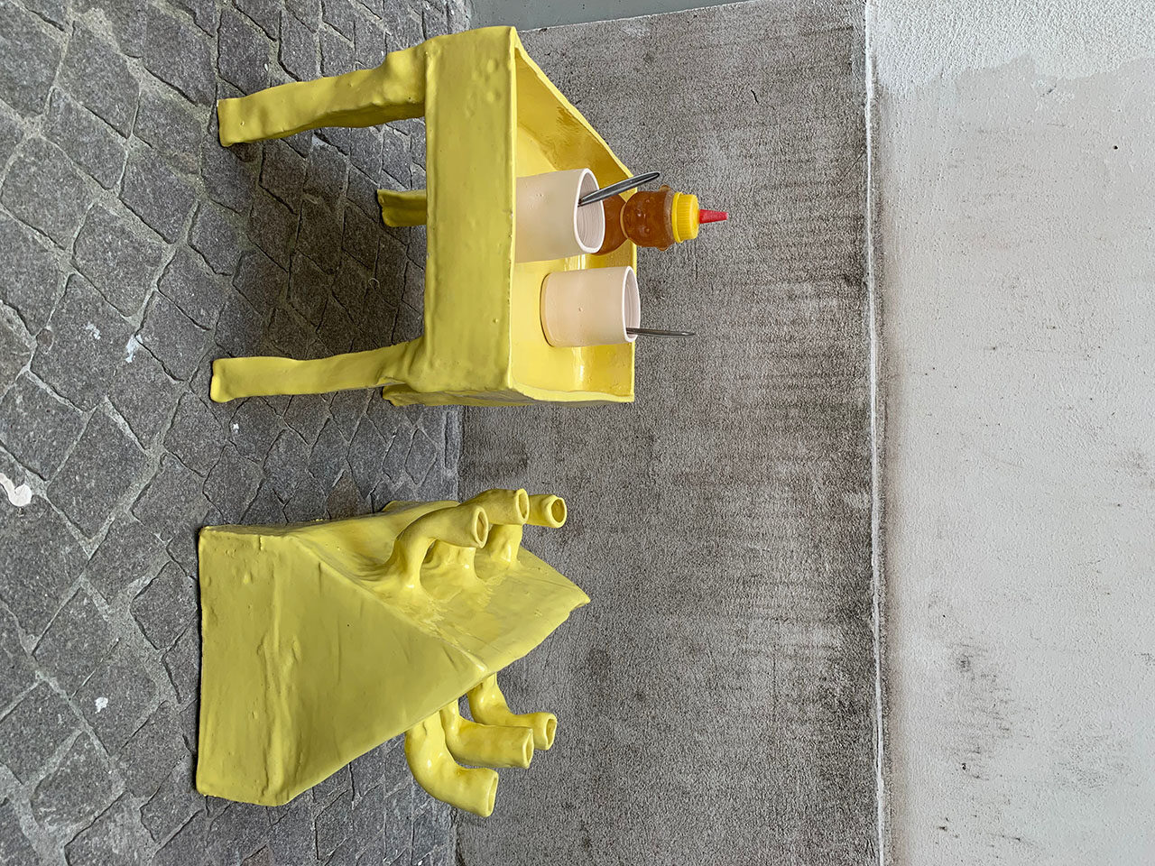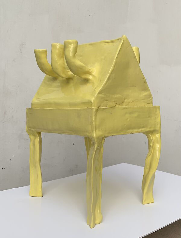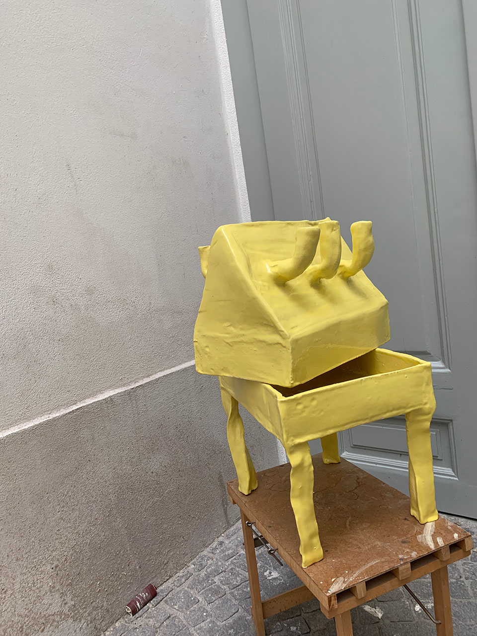 Mein gelbes Kaffeehaus ist im Juni 2021 entstanden, im Rahmen eines Projektes für die VIENNA DESIGN WEEK. Der Titel des Projekts war Apocalyptic Kaffeehaus, und da wir gerade zum weiß nicht wievielten Mal in between lockdowns waren, habe ich das Projekt sehr buchstäblich genommen und mir ein kleines Kaffeehaus gebaut, für zu Hause. Die Idee war, dass man eine Keramik bei sich zu Hause stehen hat, und indem man den Deckel abnimmt, verwandelt man automatisch sein Zuhause in ein Kaffeehaus − da der Unterteil eine Mischung aus Tisch und Tablett ist, auf dem der Kaffee serviert wird. Ich habe davor schon ein paarmal versucht eine zweiteilige Keramik zu machen, bin aber immer gescheitert, beim Kaffeehaus hat es auf den ersten Anlauf geklappt. Nach wie vor ist es eines meiner Lieblingsstücke.