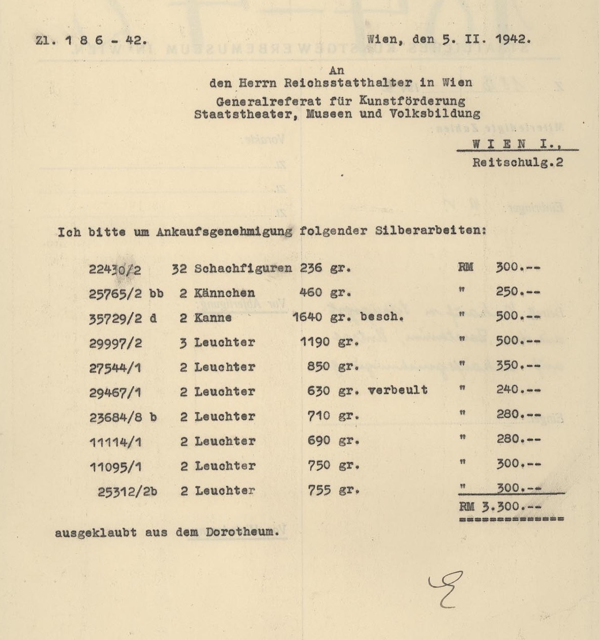 Zwischen Dezember 1941 und Jänner 1943 kaufte Direktor Richard Ernst (1885–1955) für das Staatliche Kunstgewerbemuseum in Wien, das heutige MAK, im Auktionshaus Dorotheum insgesamt 77 Silberobjekte: 25 Leuchter, fünf Kannen, sechs Teller, zwei Samoware, zwei Deckelhumpen, zwei Näpfe, eine Schüssel, einen Becher, einen Deckelpokal und ein 32-teiliges Schachspiel. Noch im Lauf des Jahres 1943 gab das Museum 13 der Objekte im Tauschweg an Kunsthändler ab. 64 Silberobjekte verblieben im Besitz des MAK. 1998 begann die Kommission für Provenienzforschung, die Sammlungen der Bundesmuseen auf in der NS-Zeit entzogene Stücke zu überprüfen.