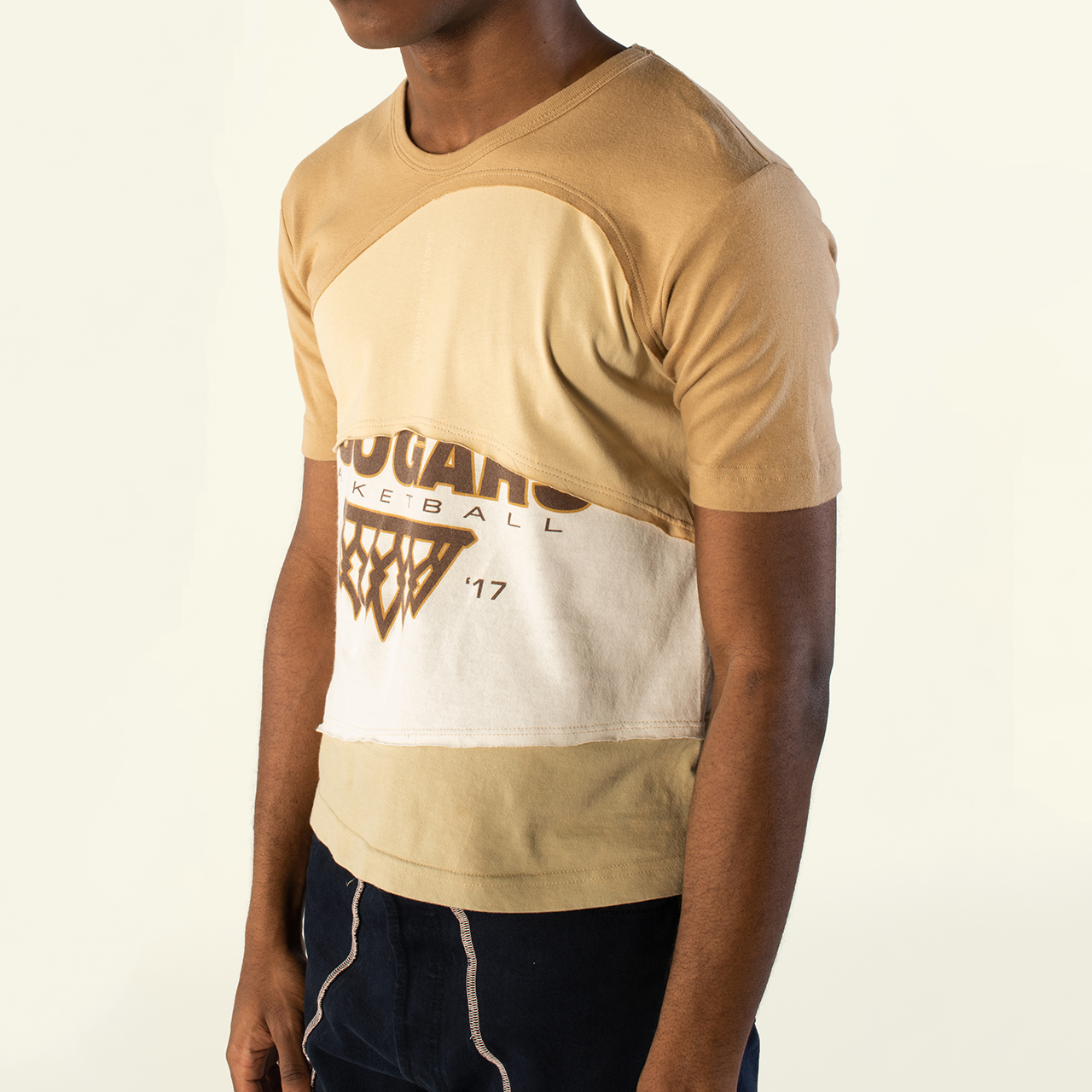 - DEAD WHITE MENS CLOTHES (DWMC), Tabia Shirt aus der Hair Bleach collection, 2020 aus zwei Vintage- und einem Deadstock-Shirt gearbeitetes T-Shirt Onesize, Einzelstück Baumwolle, gebleicht © DWMC
