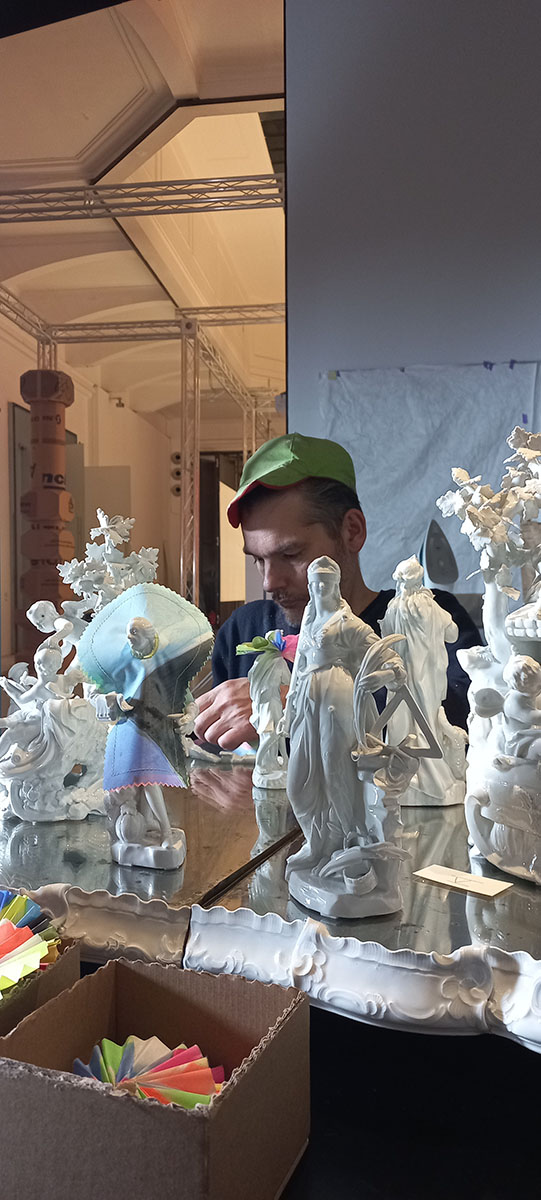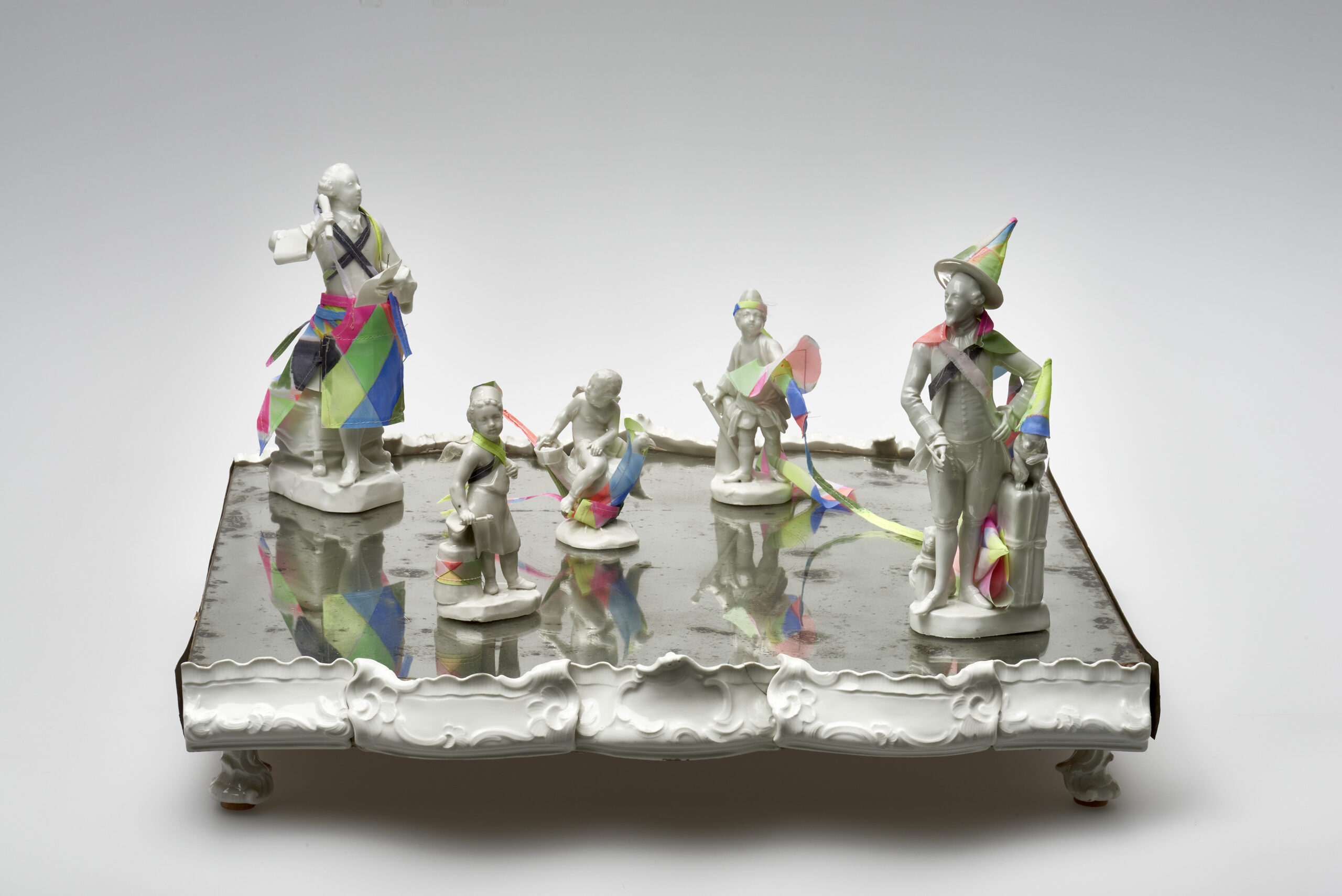 Dem musealen Hauptwerk aus der Kaiserlichen Porzellanmanufaktur Wien, das permanent in der MAK Schausammlung Barock Rokoko Klassizismus zu sehen ist, möchte der 1975 in Hallein bei Salzburg geborene, in Wien lebende Künstler Thomas Hörl mit einer zeitgenössischen künstlerischen Kontextualisierung zu neuer, geänderter Aufmerksamkeit seitens der Ausstellungsbesucher*innen verhelfen. Auf Einladung von Gastkuratorin Brigitte Felderer ergänzte er im Rahmen der Ausstellung THE FEST. Zwischen Repräsentation und Aufruhr die in Biskuitporzellan ausgeführten glänzend weißen Figurinen durch seine Gestaltung. Daher auch der Titel seiner Arbeit Deleted Scene, füllt seine Gestaltung doch Leerstellen im Tafelaufsatz, die durch abhandengekommene Figuren entstanden sind.