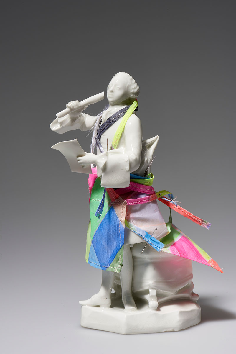- Thomas Hörl, Kostümprobe (verkleidete Figuren des Zwettler Tafelaufsatzes), 2022 Futterstoff, Acrylfarbe © MAK/Georg Mayer