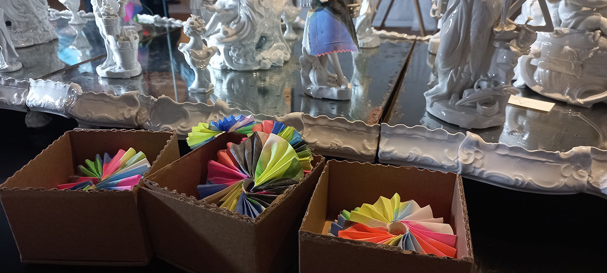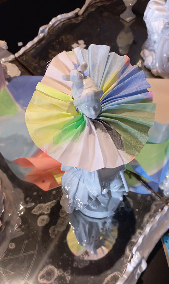 Von außerhalb der Vitrine blickt die zerlegte, in Pappmaché gestaltete und mit dem charakteristischen Kostüm des Tresteres bekleidete Figurine des Harlekins auf den Zwettler Tafelaufsatz – der zweite Teil der Installation, Thomas. Thomas Hörls künstlerische Auseinandersetzung mit dem Zwettler Tafelaufsatz ist kulturelle Recherche, der Versuch, die Aufmerksamkeit der Besucher*innen durch die Bekleidung vermehrt darauf zu lenken, sich die Figuren genauer anzusehen. Seine Kostüme sollen wieder Interesse erwecken, Flüchtiges, Vergängliches in der Harlekinade von Hörl tritt in bewussten Kontrast mit dem hochbarocken Tafelaufsatz. Ein Versuch, die abstrakte hochbarocke Festgesellschaft neu künstlerisch zu deuten.