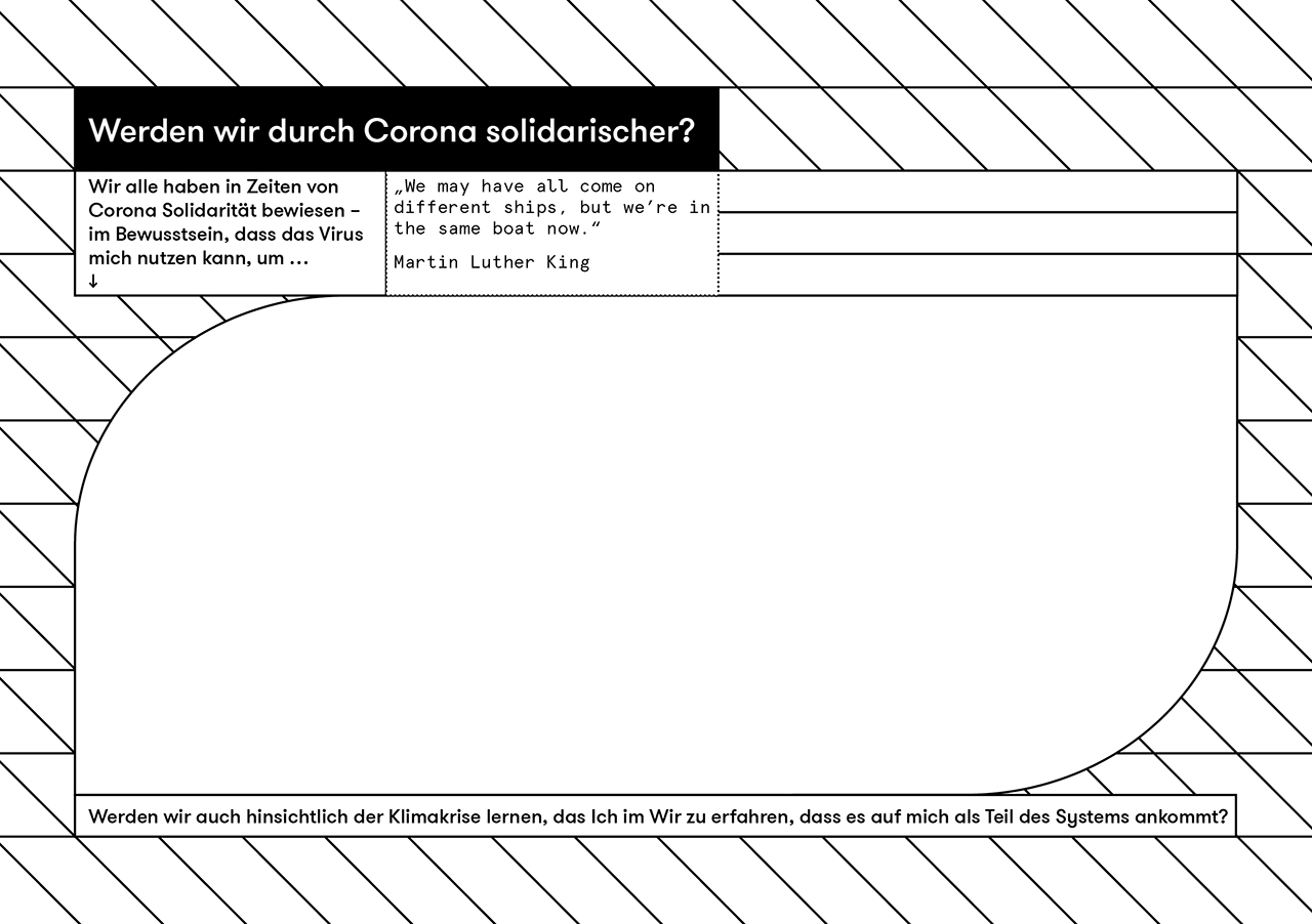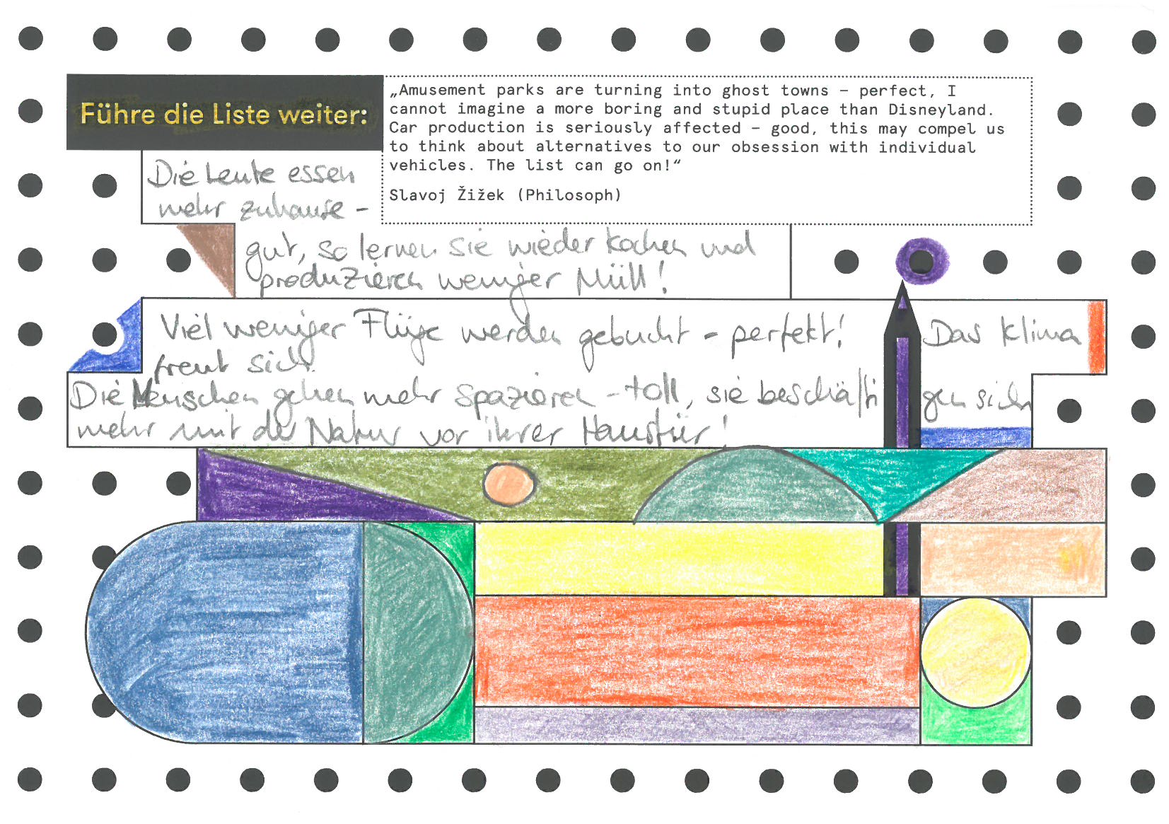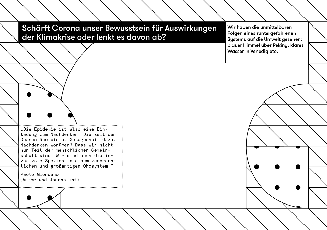 JF: 22 Fragestellungen, Statements, Zitate stehen analog zu Verfügung. BesucherInnen können sich mit spezifischen Aspekten und möglichen Konsequenzen der Pandemie und des Lock Down auseinandersetzten, ihre Beiträge hinterlassen, um von anderen rezipiert zu werden. Worksheets wurden dazu von LWZ gestaltet. Es geht um Fragen, wie wir seit Corona über Arbeit, Schule, Wohnen, Klimamaßnahmen, ökologisches und soziales Verhalten, und Wirtschaftswachstum nachdenken, wie sich unsere Zeiteinteilung verändert, was wir mehr wertschätzen oder Angst haben zu verpassen, und vieles mehr.
