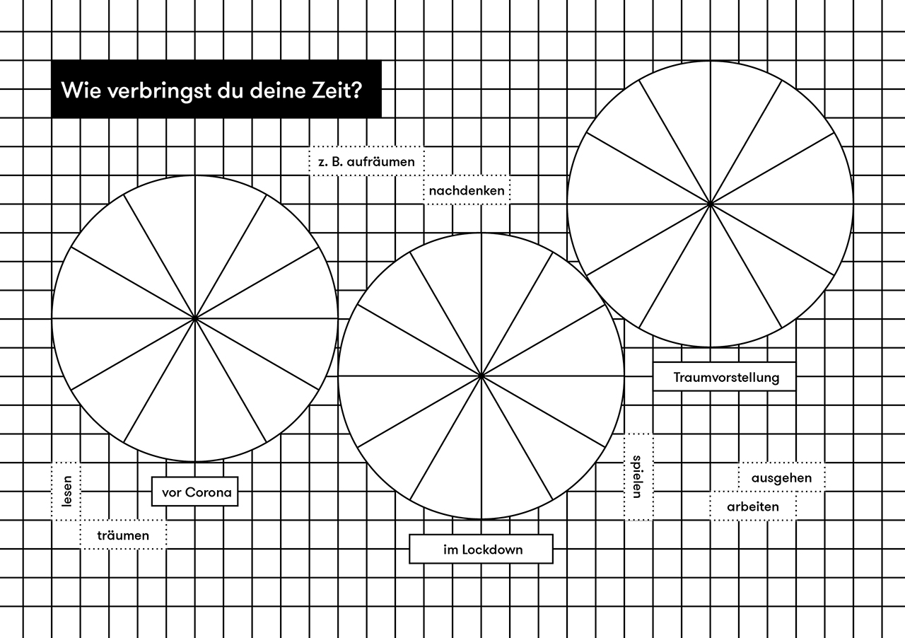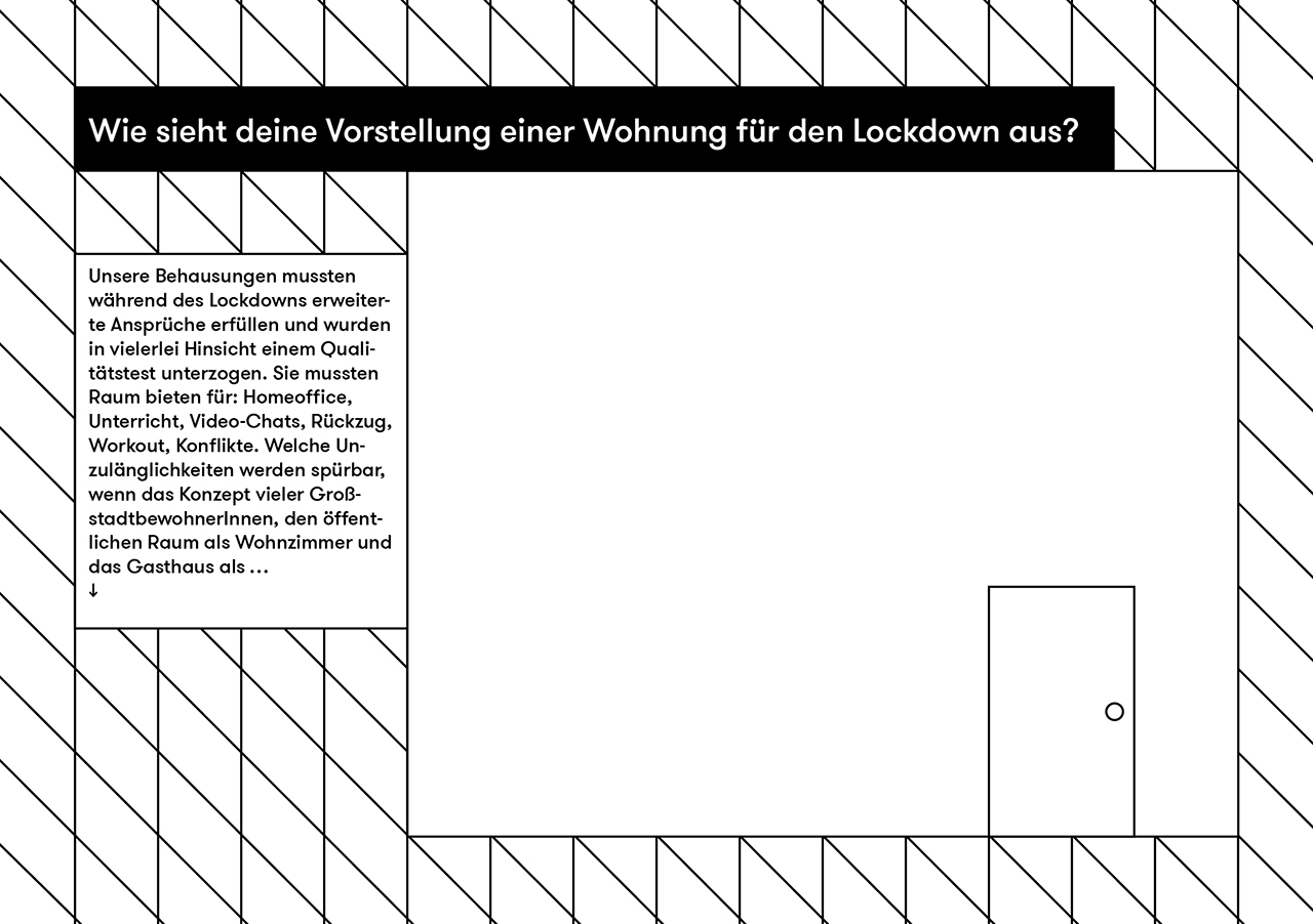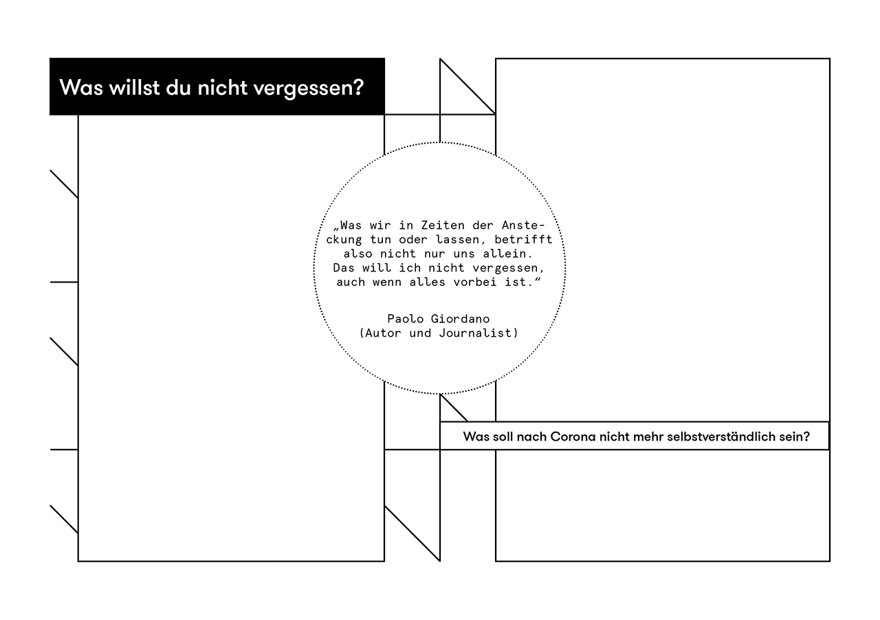 JF: 22 Fragestellungen, Statements, Zitate stehen analog zu Verfügung. BesucherInnen können sich mit spezifischen Aspekten und möglichen Konsequenzen der Pandemie und des Lock Down auseinandersetzten, ihre Beiträge hinterlassen, um von anderen rezipiert zu werden. Worksheets wurden dazu von LWZ gestaltet. Es geht um Fragen, wie wir seit Corona über Arbeit, Schule, Wohnen, Klimamaßnahmen, ökologisches und soziales Verhalten, und Wirtschaftswachstum nachdenken, wie sich unsere Zeiteinteilung verändert, was wir mehr wertschätzen oder Angst haben zu verpassen, und vieles mehr.