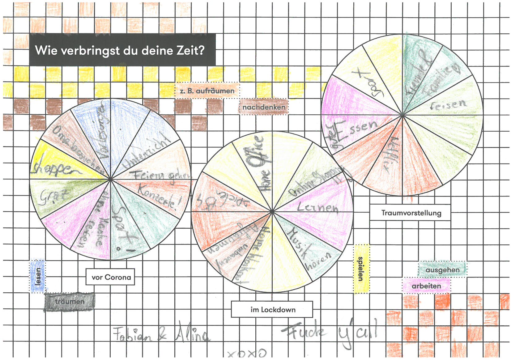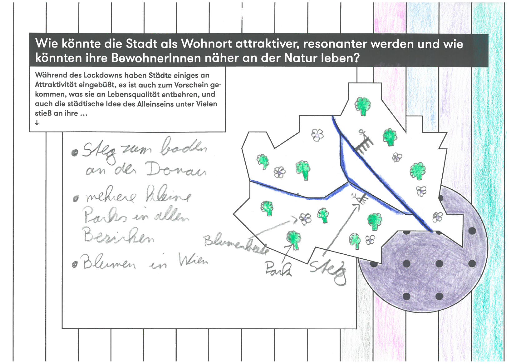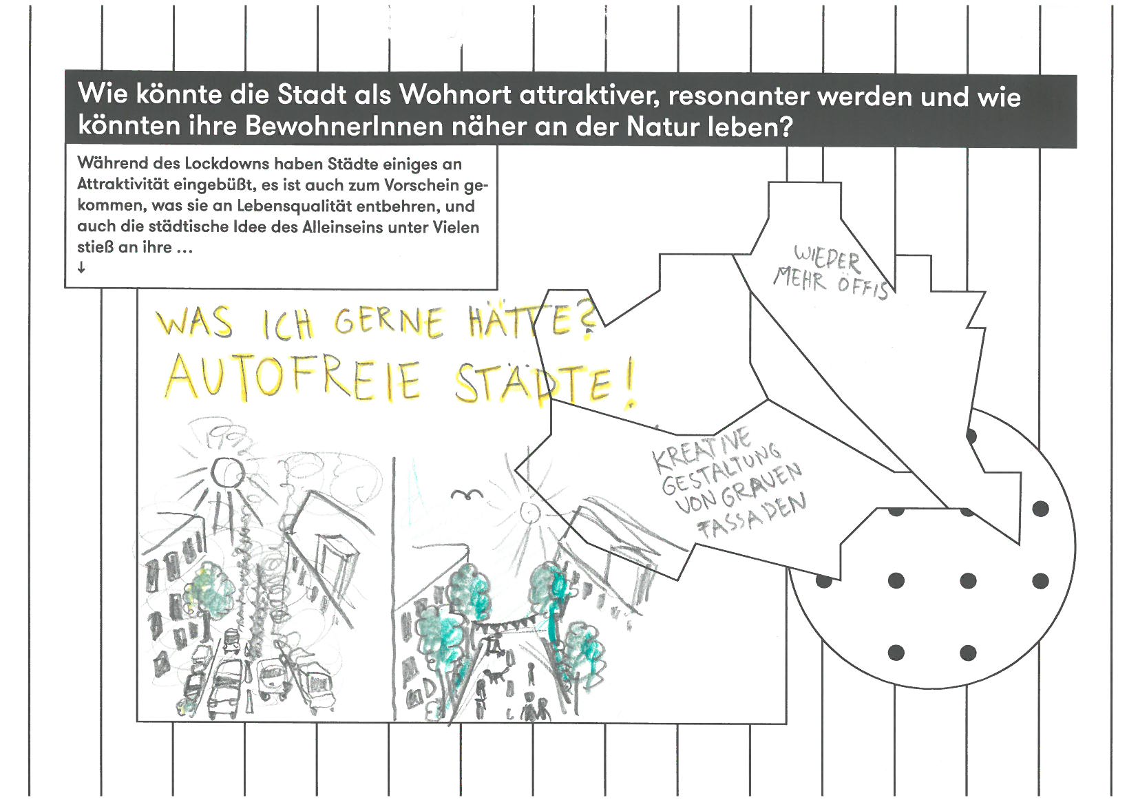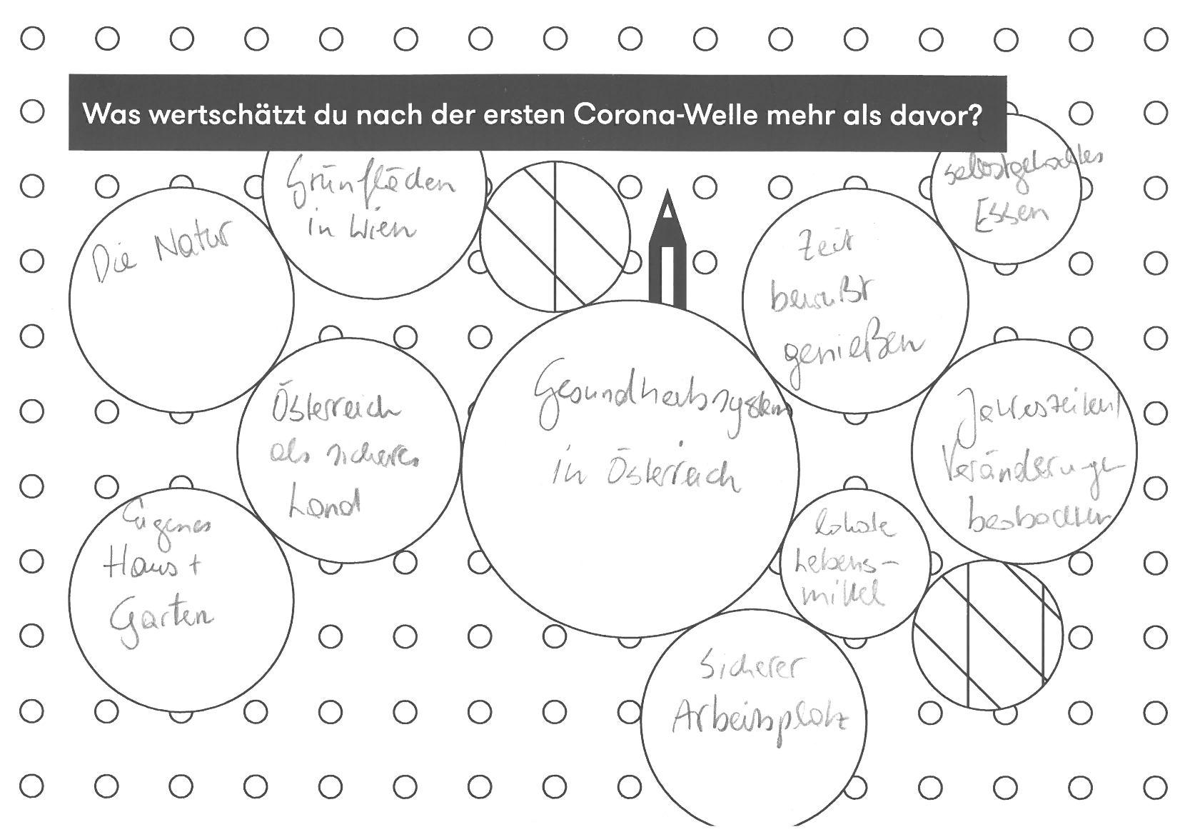Das Thema stößt jedenfalls auf Resonanz bei den TeilnehmerInnen. Die Frage der Solidarität scheint viele zu beschäftigen. Auch wenn der Wunsch nach Gemeinschaft da ist, und die Krise das Gefühl der Solidarität stärkt, wirken einige skeptisch, was die Langfristigkeit betrifft. Dass Menschen letztlich von Corona gelernt haben werden, immer genug Klopapiervorrat zuhause zu haben, lautet zum Beispiel so ein kritischer Kommentar dazu. Die Forderung von Corona für die Klimakrise zu lernen, liest sich häufig. Eine TeilnehmerIn schreibt, dass er/sie Soziale Medien zum ersten Mal als sozial wahrgenommen hat. Der Ruf nach Digitalisierungskompetenz in den Schulen liest sich häufig, der Wunsch nach Reform des Bildungssystems hat Stimmen. Das Zeitdiagramm (wie habe ich meine Zeit vor und in dem Lock Down verbracht und wie stelle ich es mir in Zukunft vor) wird gerne befüllt. Dazu, wie der Lebensraum Stadt und das Verhältnis von Stadt und Land neu gedacht werden kann, habe ich Skizzen von grünen Flächen, Bäumen, Bewegungsraum und Fahrrädern gesehen. „35 Stunden Arbeit reichen“ war eine Meldung, oder die Forderung nach einem Universal Basic Income. Auf die Fragen wie wir dem Wachstumszwang entkommen können, lautet eine Reaktion: „Niemand zwingt uns zu wachsen!“. Darauf hätte ich persönlich gern geantwortet: „Eben doch! das ist das Problem, dass Dinge die wir nicht mehr wollen, unsere Existenzgrundlage sind“. Aber die TeilnehmerIn hat recht und wirft eine wichtige Frage auf. Wer zwingt uns?